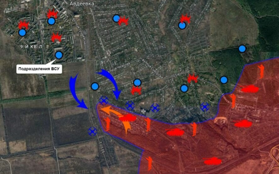 По их мнению, россияне пытаются сжать два кольца окружения вокруг украинского гарнизона в Авдеевке, одно с меньшим, а другое с большим радиусами охвата, и одновременно рассечь позиции ВСУ в самом городе, пробиваясь к микрорайону «9 квартал». С этого участка просматривается и простреливается весь город и подступы к нему – это «сердце» обороны, и если оно достанется россиянам, то удерживать оставшиеся защитные рубежи для ВСУ станет бессмысленным занятием и войска нужно будет отводить.