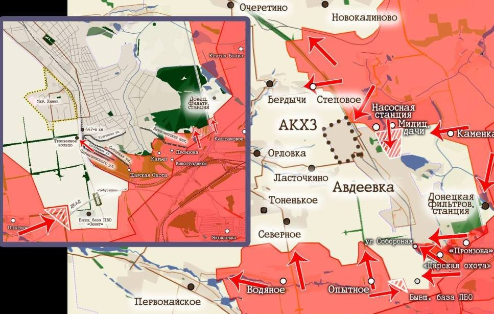 «На юго-восточных окраинах Авдеевки - жёсткие встречные бои. Российские войска даже несколько расширили зону контроля к востоку от укрепрайона „Царская охота“. А на северо-восточных они интенсивно атакуют. Позиции ВСУ в городе под мощным воздействием средств дальнего поражения ВС РФ. Российские войска даже несколько расширили зону контроля к востоку от укрепрайона «Царская охота». А на северо-восточных они интенсивно атакуют», - пишет WarGonzo.