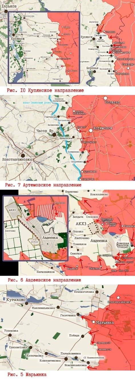 Вооружённые силы Российской Федерации (ВС РФ) продвинулись по трассе М-30 в районе Первомайского. Нет - у Тоненького и Северного (населённый пункт к западу от Авдеевки). На юго-восточных окраинах самого города - жёсткие встречные бои. А вот на северо-восточных - тактический прорыв ВС РФ. Коксохимический завод российские войска теперь могут атаковать с двух направлений, сообщает Telegram-канал Wargonzo. Попытки продвинуться у Степного (не путать с одноимёнными пунктами на Запорожском и Угледарском направлениях) успеха ВС РФ не принесли. ВСУ сумели вернуть ряд позиций у подконтрольной им Новобахмутовки (одноимённый населённый пункт восточнее за ВС РФ).
