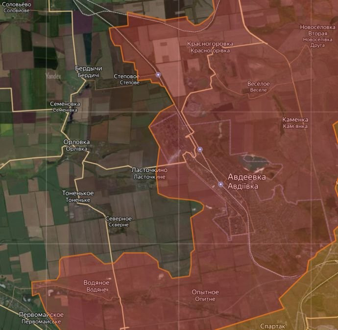 После того, как Воружённые силы Российской Федерации (ВС РФ) установили полный контроль на Авдеевкой, новая линия обороны Украины - Бердычи-Орловка, где ВСУ будут опираться на водные преграды. Из расположенного рядом с Авдеевкой населённого пункта Ласточкино украинские войска бегут по той причине, что в непосредственной близости расположен Авдеевский коксохимический завод, который контролируется российской армией.