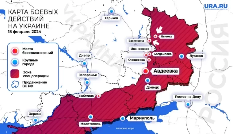 Обновлённая карта боевых действий на Украине по данным на 12:00 мск сегодня, 18.02.2024