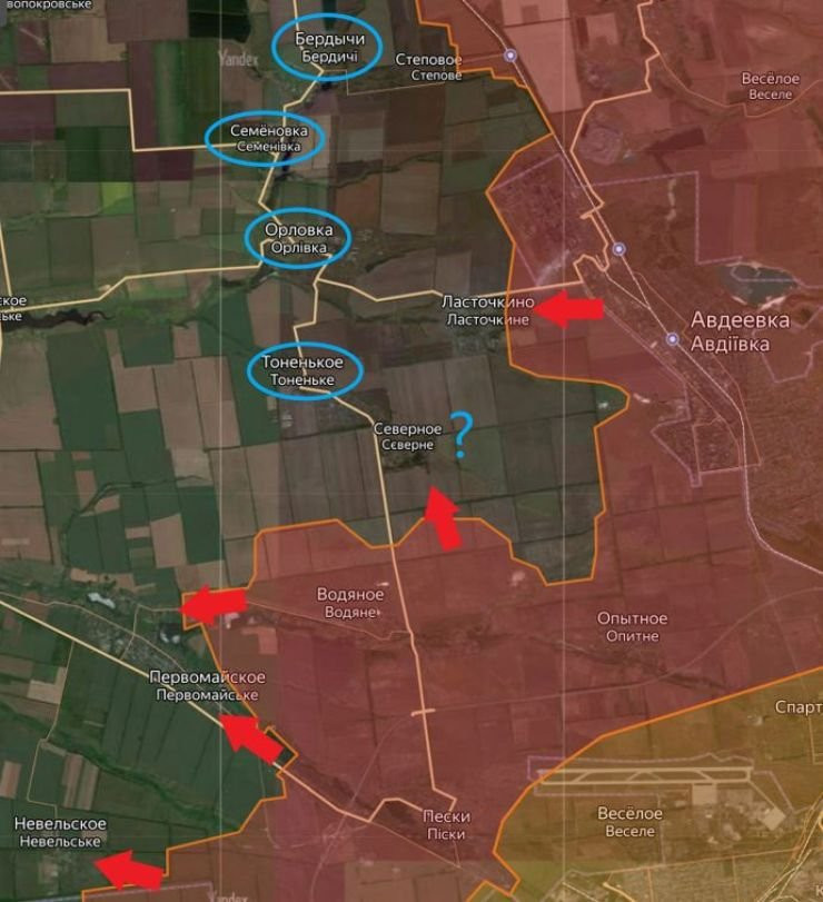 Юго-западнее Авдеевки ВСУ вышли из Ласточкино. ВС РФ пока не взяли населённый пункт под свой контроль - он находится на текущий момент в серой зоне. Враг расположился в районе населённых пунктов Бердычи, Семёновка, Орловка, Тоненькое. По Северному информация противоречивая - либо ВСУ там останутся и попробуют удержать оборону, то ли будут выходить в ближайшее время. На юго-западе, в Первомайском и в районе Невельского продолжаются бои. Эти населённые пункты ещё только предстоит взять.