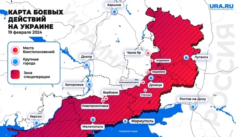 Обновлённая карта боевых действий на Украине по данным на 12:00 мск сегодня, 19.02.2024