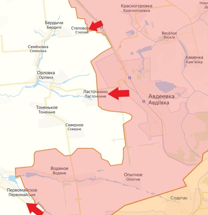 Подразделения ВС РФ атакуют позиции врага в населённом пункте Ласточкино к юго-западу от Авдеевки. Взять под полный контроль его пока что не удалось.