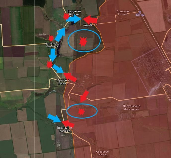 Западнее Авдеевки фронт остается нестабильным, и противник осуществляет контратаки. Бои продолжаются у Бердычей, Тоненького и Орловки. Наши войска также продвигаются к железнодорожной линии на южных окраинах Красногоровки, и в Георгиевке также отмечаются успехи.