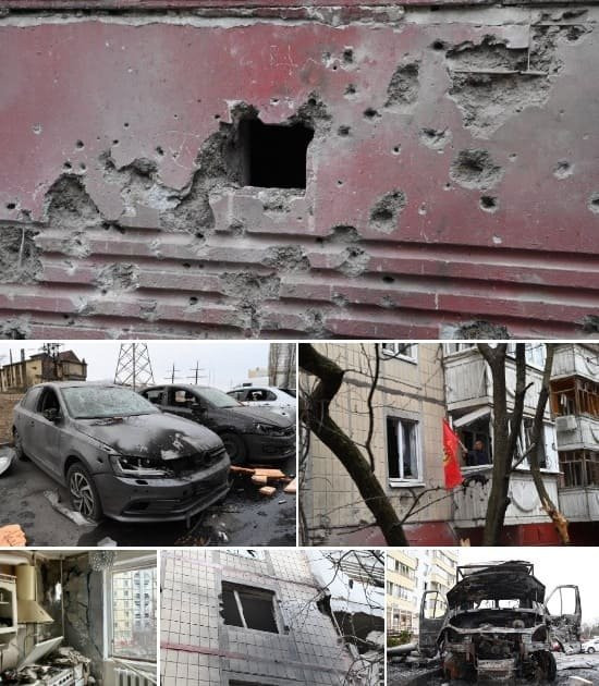 На опубликованных снимках видны сильные повреждения жилого дома: выбиты стекла окон и балконов, а также частично обрушился фасад здания. Также повреждены несколько автомобилей, один из которых полностью сгорел.