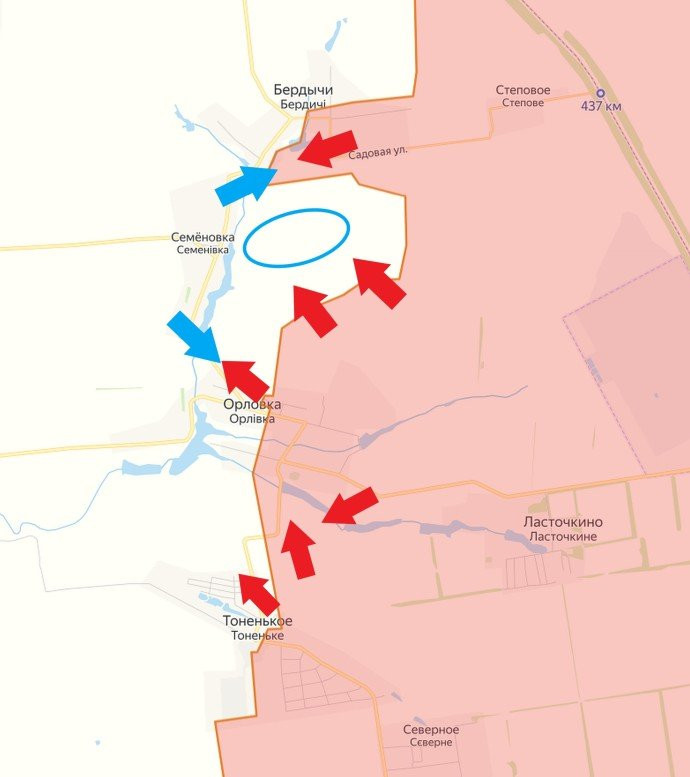 Подразделения Вооруженных сил России после закрепления в южной части Бердычей продвинулись между Бердычами и Орловкой в направлении Семеновки, следует из интерактивной карты СВО, подготовленной проектом "Z комитет". По его данным, российские войска потеснили 25-ю отдельную воздушно-десантную бригаду и 3-ю отдельную штурмовую бригаду ВСУ.