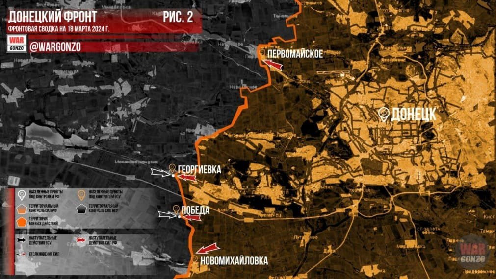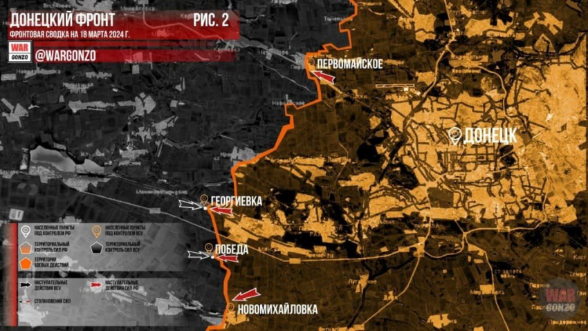 Сводка от 18 марта 2024 года - карта боевых действий, ситуация на фронтах, обстановка в Донбассе. На Авдеевском направлении не смолкают тяжёлые бои. Вооружённые силы Российской Федерации (ВС РФ) ведут штурм Богдановки, Ивановского и Первомайского. Новости последних часов из зоны проведения специальной военной операции (СВО).
