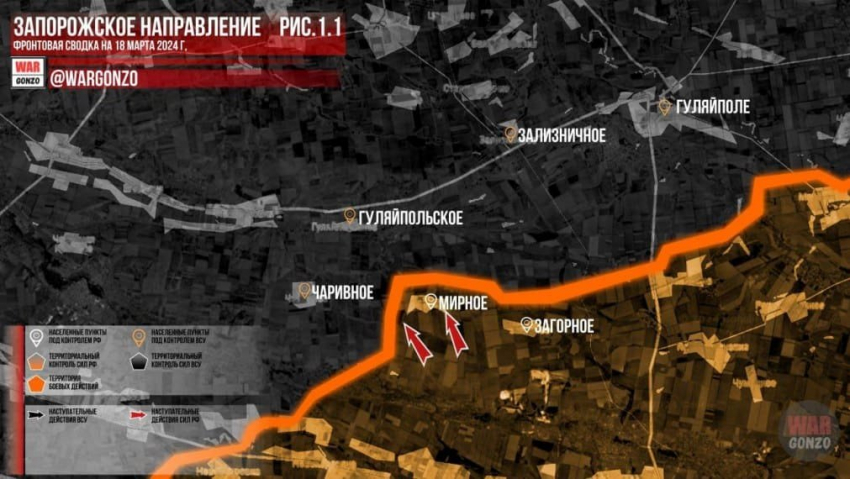 На Запорожском направлении российские войска установили контроль над населенным пунктом Мирное, который находится к юго-западу от Гуляйполя. На Ореховском направлении интенсивно продолжаются боевые действия за Работино, в то время как к северу от Вербового отмечены определенные успехи. Ситуация в районе Времевского выступа остается без изменений. В течение нескольких недель проводятся наступательные операции с целью прорыва через узкую зону шириной в 12 км, что привело к продвижению в данном районе, сообщает военкор Евгений Лисицын в Telegram-канале.