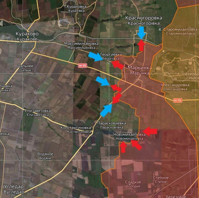 На Донецком фронте тоже без существенных изменений. Идут активные бои на линии Тоненькое-Орловка-Бердычи. Здесь Вооружённые силы Российской Федерации (ВС РФ) стремятся развить наступление к Семёновке и выбить Вооружённые силы Украины (ВСУ) из Бердычей. Встречные бои в районе Победы и Первомайского.