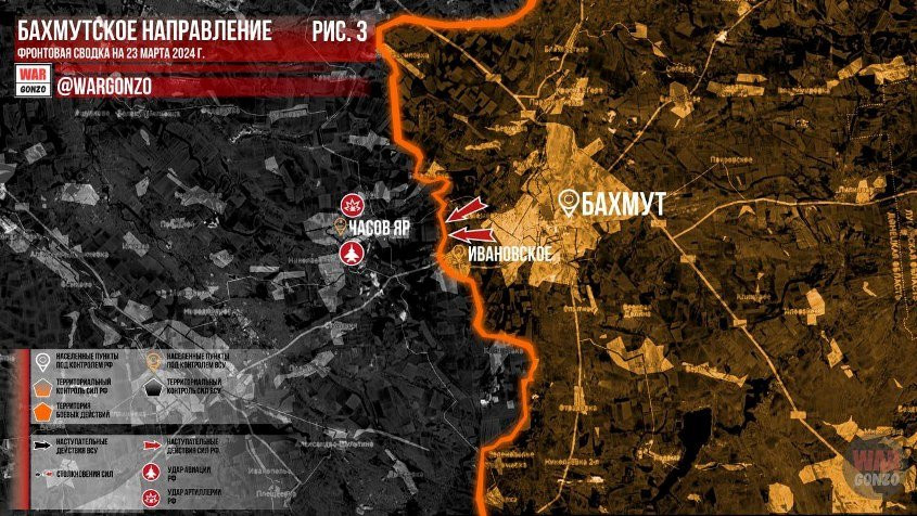 На Артёмовском направлении российские войска стремятся пробиться к Часов Яру севернее Ивановского (Красного). По самому городу активно работает авиация и артиллерия ВС РФ, передаёт Telegram-канал Wargonzo.