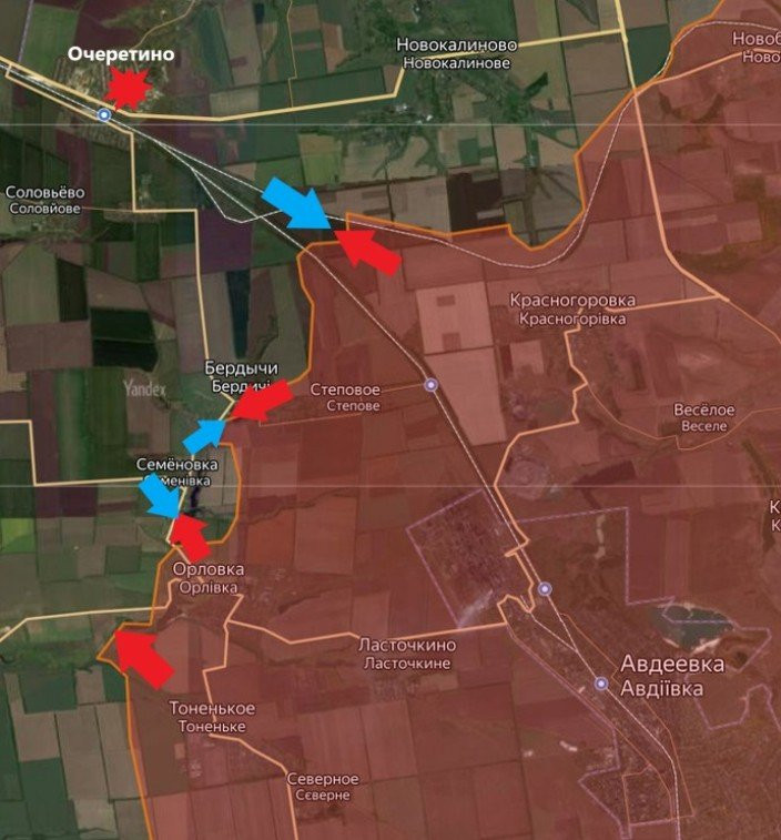 Со стороны населённых пунктов Орловка и Тоненькое подразделения ВС РФ продолжают продвигаться на север. Таким образом они занимают максимально выгодные позиции для дальнейших наступательных действий на столь важном со стратегической точки зрения направлении, как Авдеевское.