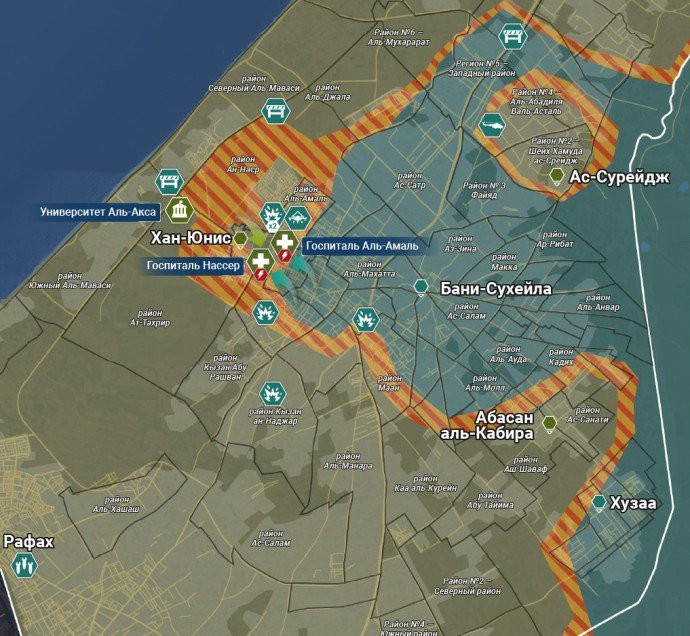 Если взглянуть на южную часть сектора Газа, то здесь наблюдается следующая картина: в Хан Юнисе продолжаются столкновения в районе медицинских комплексом Аль-Амаль и Нассера. ЦАХАЛ арестовывает всех подряд для дальнейших разбирательств.