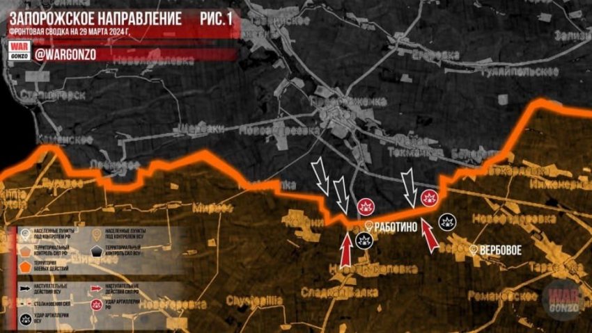 Происходят стычки в районе Работино и Вербового. Противник активно использует беспилотники и кассетные артиллерийские боеприпасы. Также враг готовит вторую линию обороны у Орехова.