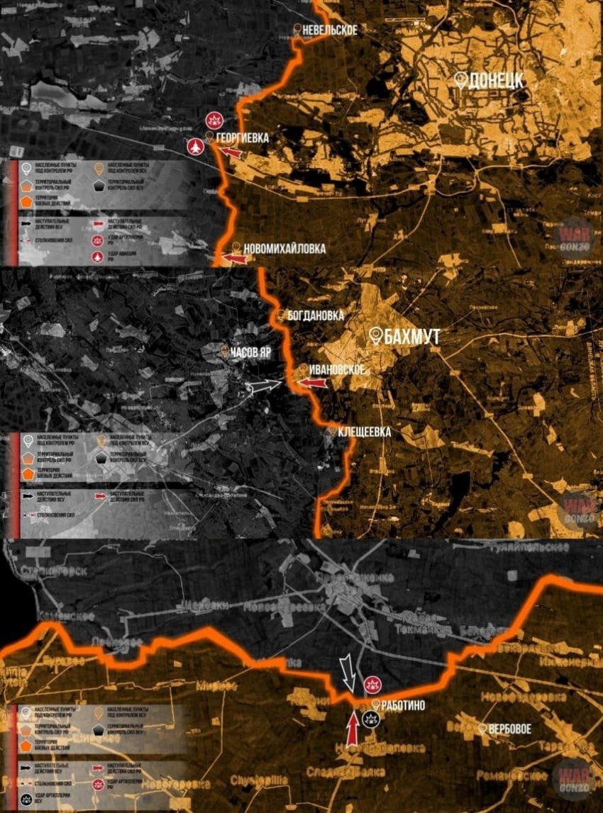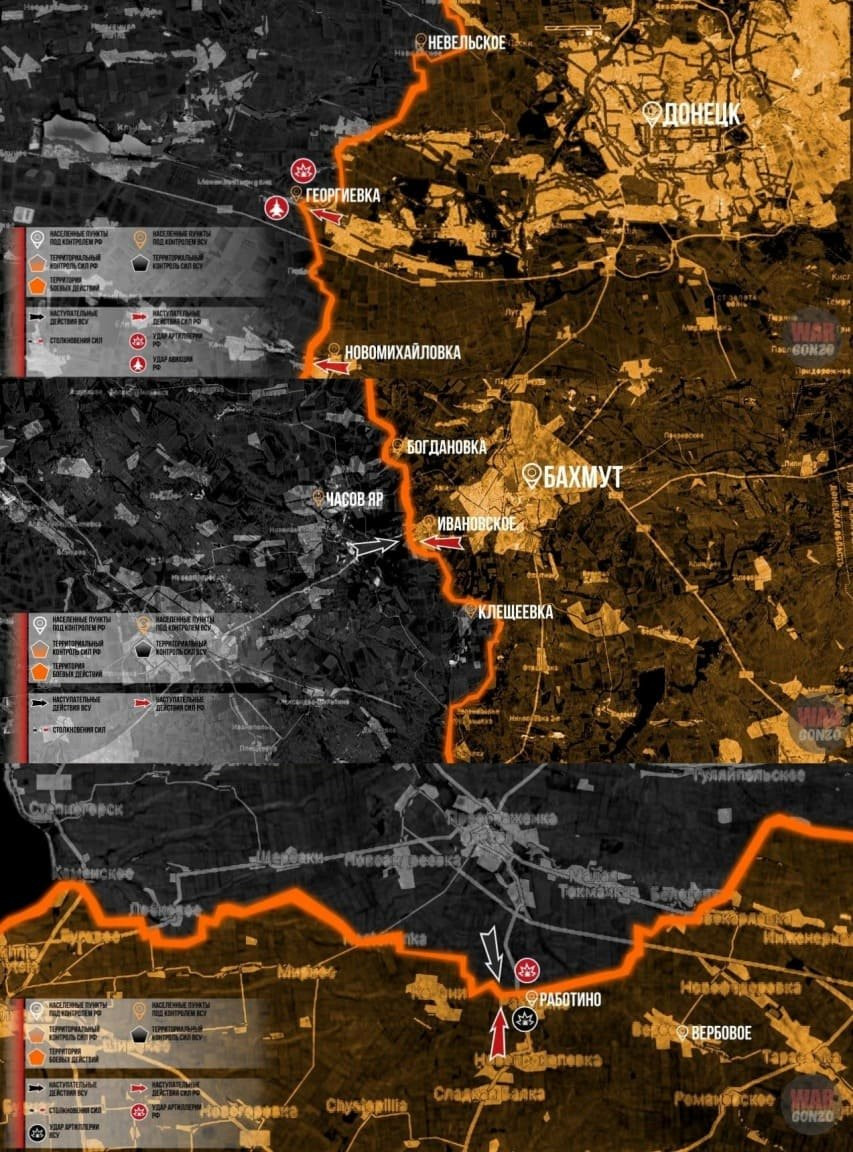 Также сообщается о расширении зоны контроля российских войск южнее Артёмовска, в частности, в районе Клещеевки, где было зафиксировано продвижение на глубину до полукилометра.