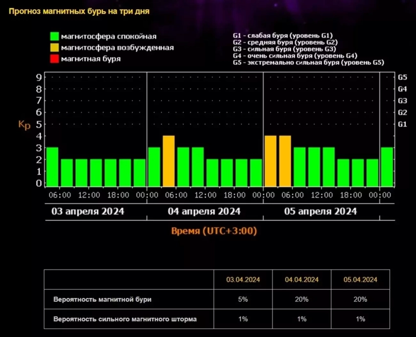 Из актуальных данных следует, что в среду, 3 апреля, прогнозируется магнитная буря, мощность которой составит 4 балла. Она будет наиболее заметна в период с 12:00 до 18:00, после она стихнет до 3 баллов.