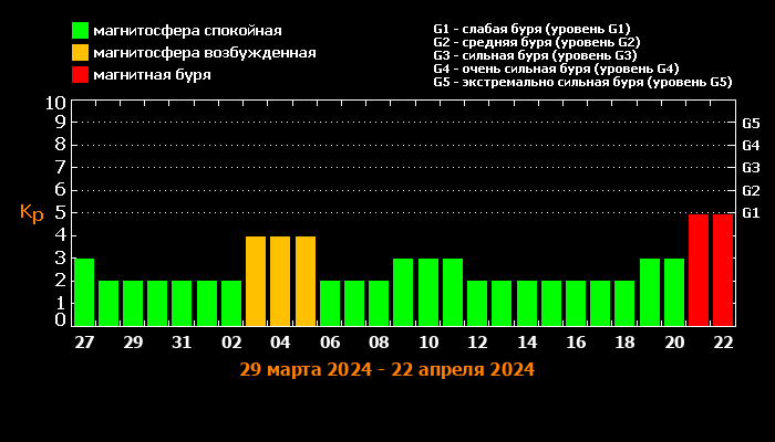 В пятницу, 19 апреля, с 01:00 до 04:00 ожидается слабая геомагнитная буря (3 балла). В остальные часы возможны небольшие возмущения.