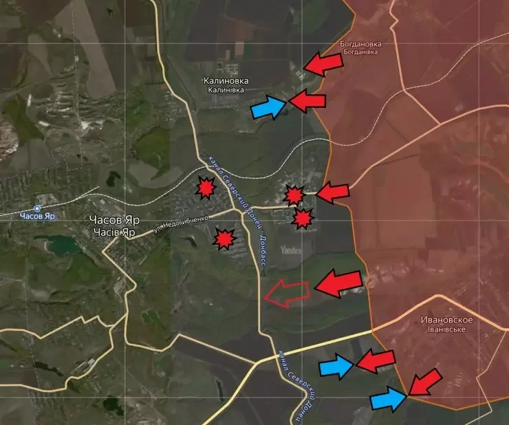 Часовоярское направление. Здесь особых изменений в ЛБС не зафиксировано. Продолжаются бои на восточных окраинах Часов Яра, в районе Богдановки и Клещеевки. По позициям ВСУ активно работает ВКС РФ.