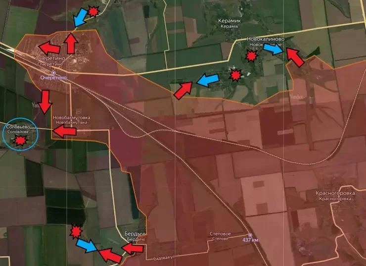 Российские войска в течение нескольких часов в ночь на 25 апреля проводили беспрерывное огневое воздействие на позиции 47-й и 100-й бригад в селе Соловьёво юго-западнее Очеретино. Остатки 47-й бригады после фактического разгрома в Очеретино отступили именно в сторону Соловьёво, и на то же направление были брошены подразделения 100-й бригады Вооружённых сил Украины (ВСУ) «для удержания линии фронта и оказания поддержки 47-й бригаде».