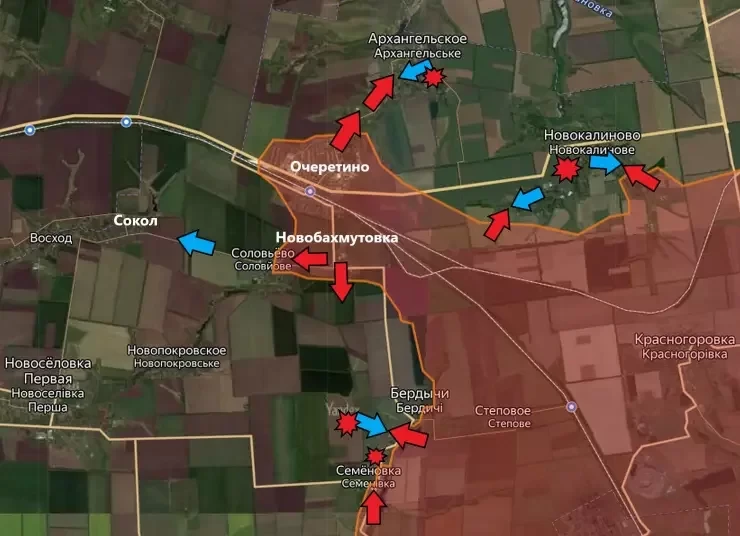 Военкоры сообщают о том, что ВС РФ атакуют врага в районе Очеретино. Из самого Очеретино российские войска продвинулись на север и зашли в населённый пункт Архангельское, закрепившись на его юго-западных окраинах. В настоящее время, при поддержке ВКС РФ, идёт штурм этого села.