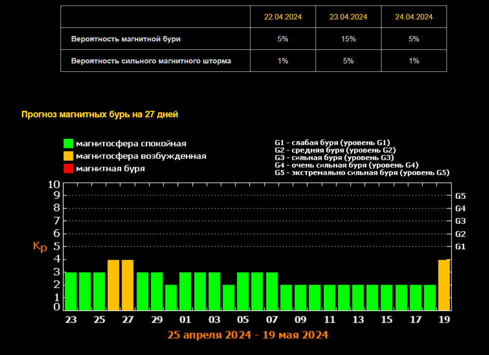 В субботу, 27 апреля, с 01:00 до 07:00 и с 16:00 до 22:00 ожидается слабая геомагнитная буря (3 балла). В остальные часы вероятны небольшие возмущения.