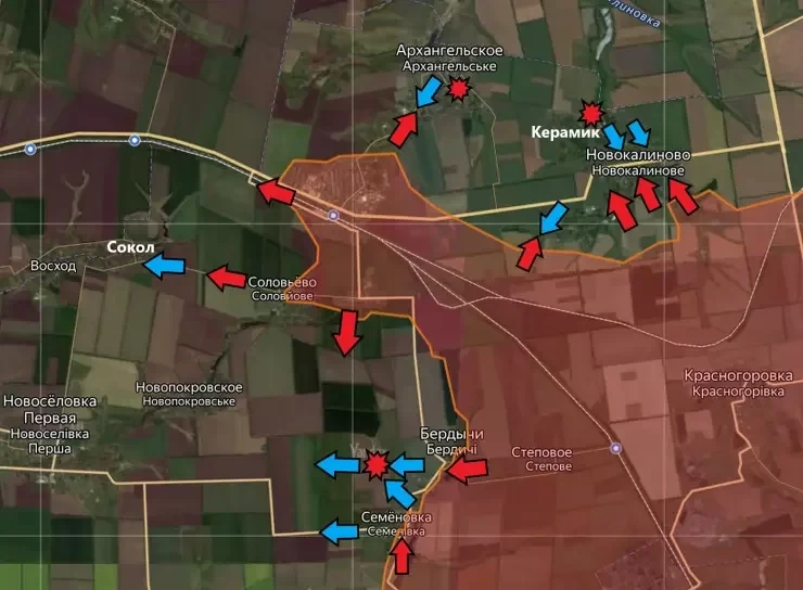 «Под угрозой Новокалиново (которую штурмуют российские войска), Керамик и Архангельское. К югу от Очеретино противник будет постепенно откатываться на линии водоемов и Карловского водохранилища», - подчеркнул Рожин. Освобождение населённых пунктов подтверждается соответствующими видеозаписями, указал эксперт в своём Telegram-канале.