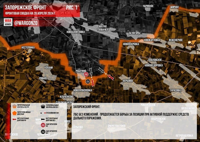 Новая карта боевых действий на Украине по состоянию на 12:00 мск сегодня, 28 апреля 2024 года