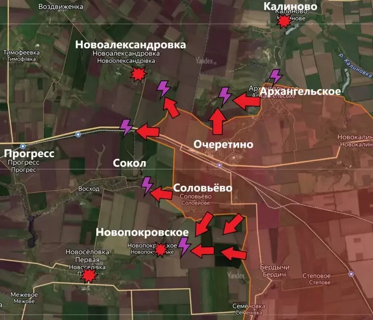 Чуть южнее идут бои на дороге между сёлами Сокол и Соловьёво. Также уточняется, что ВС РФ подобрались вплотную к населённому пункту Новопокровское.