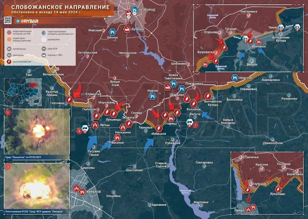 На Харьковском фронте армия России наступает. В Волчанске идут бои в застройке, по разным данным под нашим контролем не менее четверти города. Наши охватывают его с востока и запада, чтобы взять в клещи. За сутки освобождено минимум три села – Лукъянцы, Глубокое и Бугроватка. В последнем сподручно создать переправу через реку. Подошли наши и к Липцам, что в направлении Харькова. На Сумском направлении активна наша артиллерия, Киев ждет наступления и здесь.
