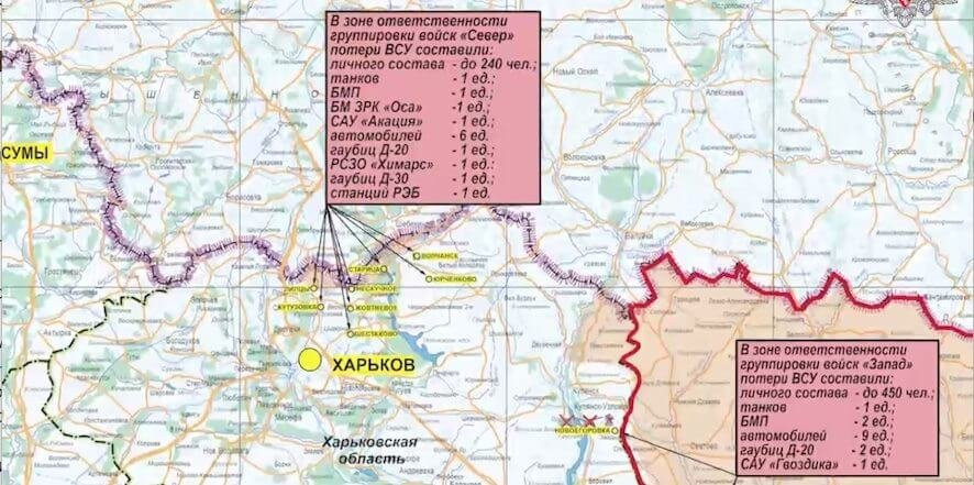 Всего с начала проведения специальной военной операции уничтожены: 607 самолетов, 274 вертолета, 24964 беспилотных летательных аппарата, 525 зенитных ракетных комплексов, 16219 танков и других боевых бронированных машин, 1326 боевых машин реактивных систем залпового огня, 9998 орудий полевой артиллерии и минометов, а также 22182 единицы специальной военной автомобильной техники.