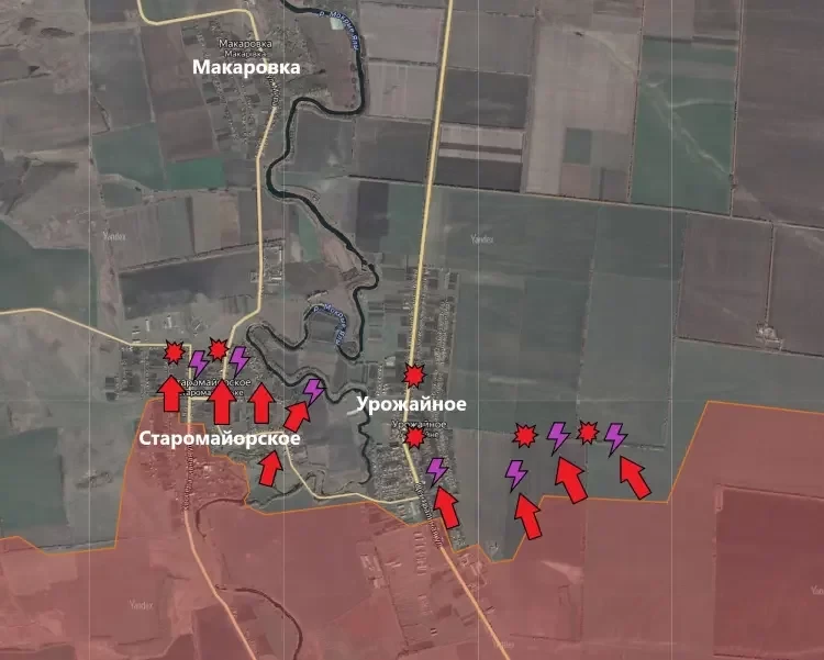 Помимо всего этого, бои идут и восточнее Урожайного. Походе, что подразделения ВС РФ пытаются подобраться к позициям ВСУ в селе с фланга.