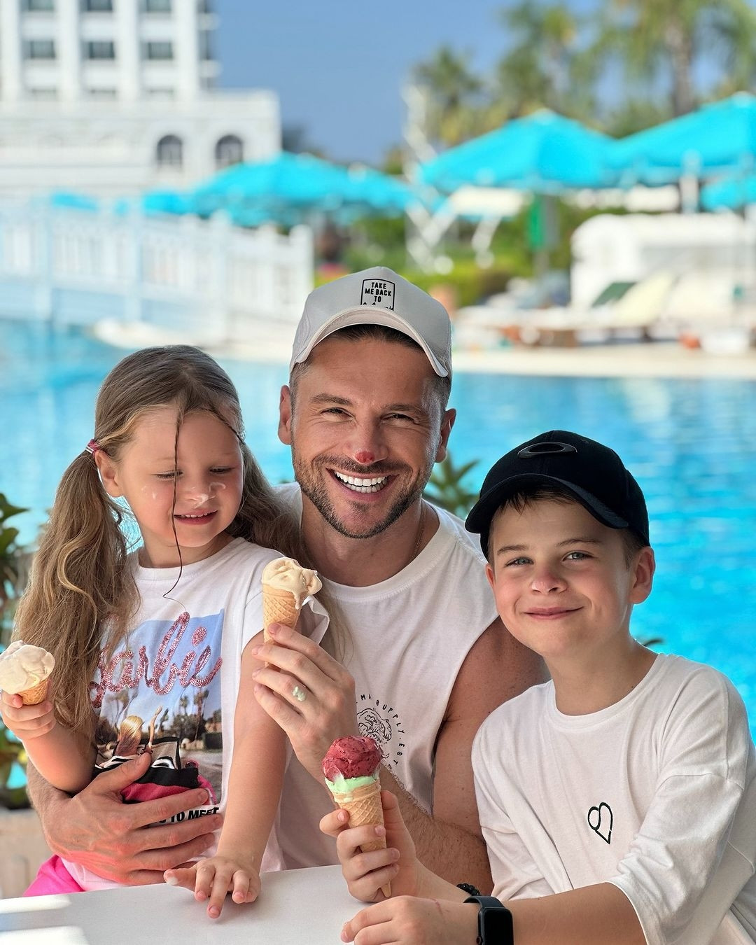Семья проводит отпуск на одном из турецких курортов, наслаждаясь временем у бассейна. На размещенном снимке все трое держат мороженое и искренне улыбаются, глядя в объектив камер.