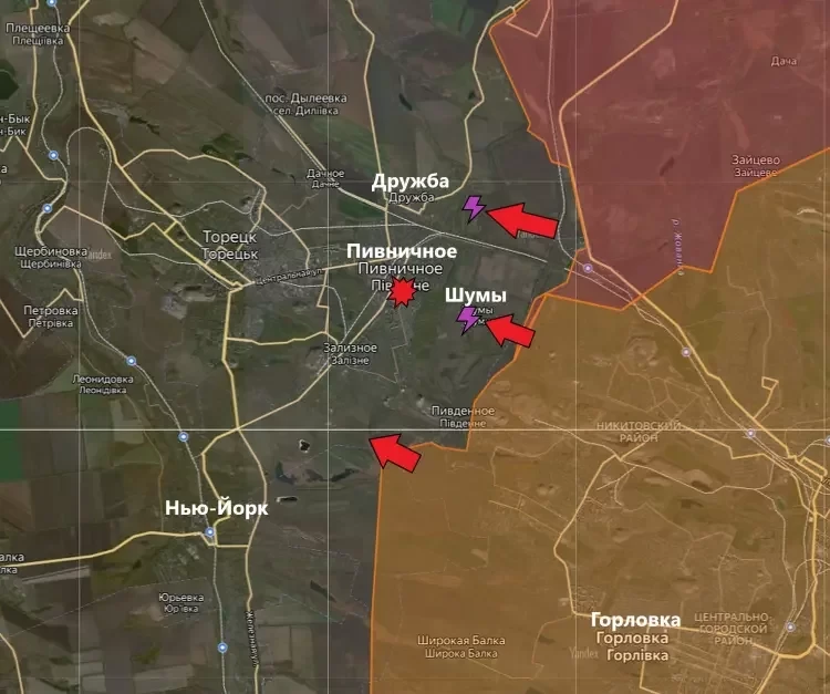 Также идут бои в окрестностях Горловки, ВС РФ наступают на населённый пункт, который украинские власти переименовали в Нью-Йорк.