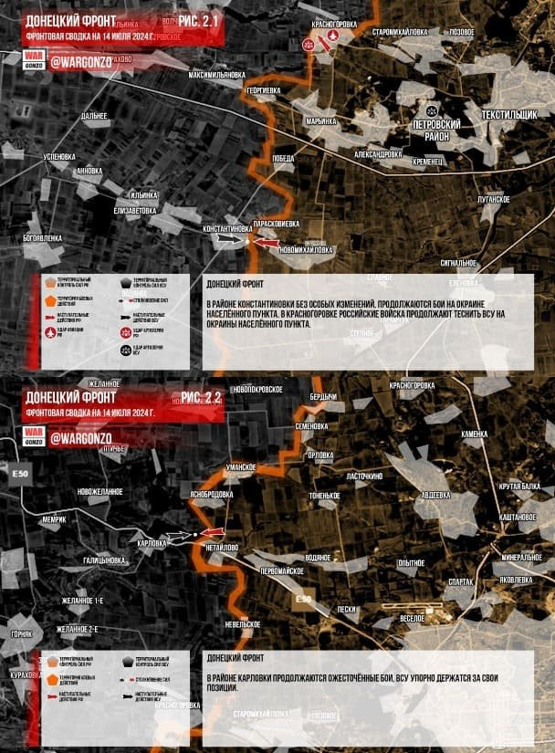 Обновлённая карта боевых действий на Украине по данным на 12:00 мск сегодня, 14.07.2024