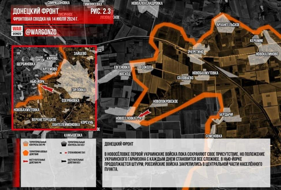 На Донецком фронте российские войска смогли продвинуться в Урожайном, значительно расширив зону подконтрольную ВС РФ. В районе Константиновки без особых изменений, продолжаются бои на окраине населённого пункта. В Красногоровке российские войска продолжают теснить ВСУ на окраины населённого пункта. В районе Карловки продолжаются ожесточённые бои, ВСУ упорно держатся за свои позиции. В Новосёловке Первой украинские войска пока сохраняют свое присутствие, но положение украинского гарнизона с каждым днем становится все сложнее. В Нью-Йорке продолжается штурм, российские войска закрепились в центральной части населённого пункта.