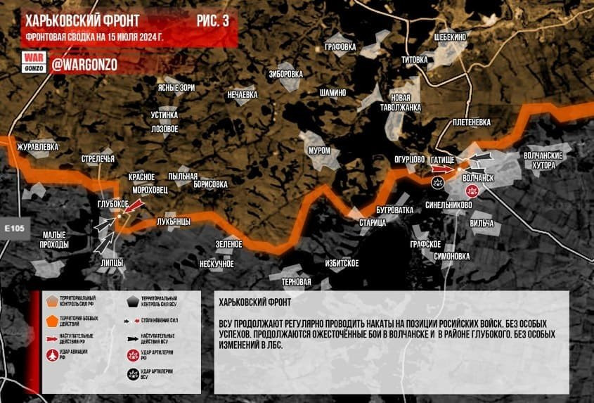 Новая карта боевых действий в зоне СВО на Украине сегодня, 15 июля 2024 года