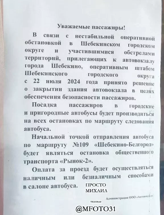 Автовокзал в Шебекино приостанавливает свою работу. Сообщается, что это временная мера из-за частых обстрелов муниципалитета.