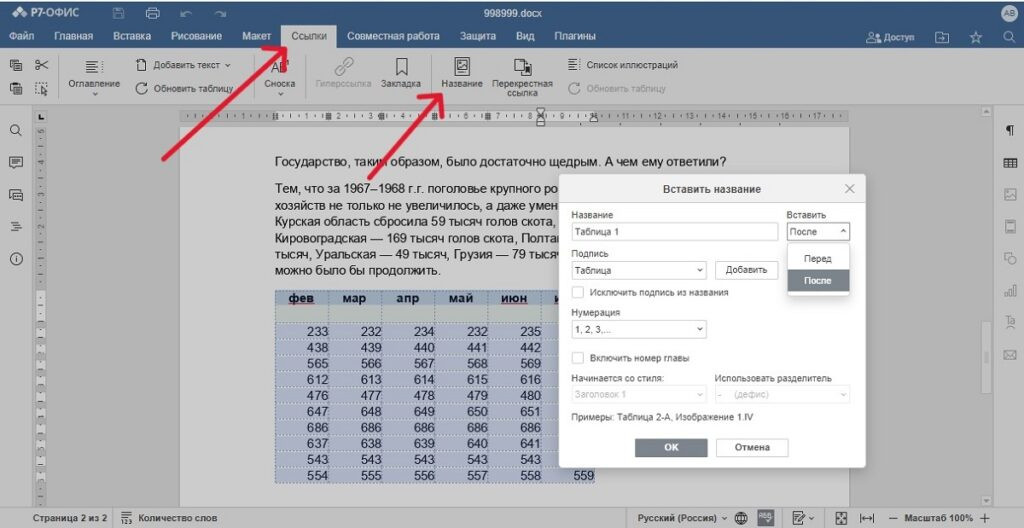 Все подписи в документе будут сопровождаться нумерацией: Таблица 1, Таблица 2 и так далее. Чтобы разместить название над объектом в документе надо в поле «Вставить» в выпадающем списке выбрать вариант «Перед», чтобы разместить его под объектом — выбрать «После».  И нажать на кнопку «ОК».