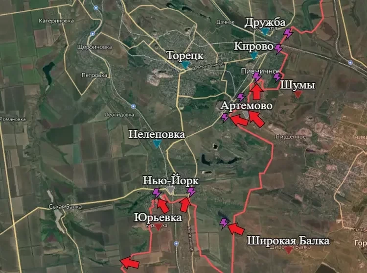 На Торецком направлении российские войска с боями продвигаются в границах Артёмово (Зализного), Кирово (Пивничного), a также расширяют «клин» в границах Нью-Йорка (Новгородского) у машиностроительного завода. Противник предпринимает попытки контратаковать, однако стабилизировать фронт украинские формирования пока не могут даже после переброски подкреплений, пишет PulsePen.