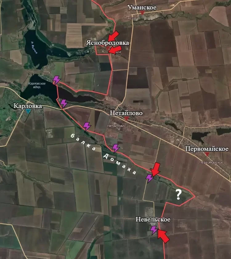 Продолжаются встречные бои на севере и юге Карловского водохранилища. Уже несколько недель нашим бойцам не удаётся расширить зону контроля. Предположительно, штурм Карловки начнётся после того, как наши бойцы смогут пересечь балку Домаха и подобраться к населённому пункту с юго-востока.
