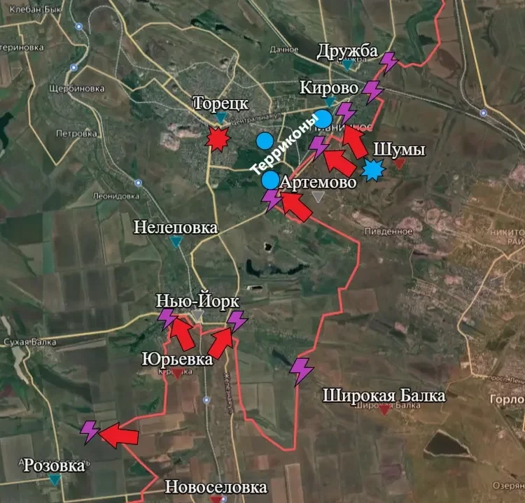 На Торецком направлении В районе Дружбы продолжаются встречные бои без продвижения ВС РФ. В пгт Кирово (Пивничное) подразделения Армии России продолжают продвигаться на запад и север. День за днём наши бойцы буквально выгрызают у противника его позиции. В районе Артёмово (Зализного) штурмовые группы ВС РФ продолжаются зачистку населённого пункта и ведут бои близ террикона. Это террикон шахты имени Артёма, на котором ВСУ оборудовали укрепленные позиции, построенные c применением железобетонных конструкций, пишет PulsePen. Ситуация постепенно приближается к штурму Торецка. Линия фронта на этом участке почти выровнена, остаётся лишь зачистить Кирово и Артёмово от присутствия врага, а также выбить его с территории двух терриконов до Торецка и с одного уже в пределах города. В Нью-Йорке также есть небольшое продвижение. К западу и востоку от центра. Также бои ведутся в направлении Розовки и Пантелеймоновки.