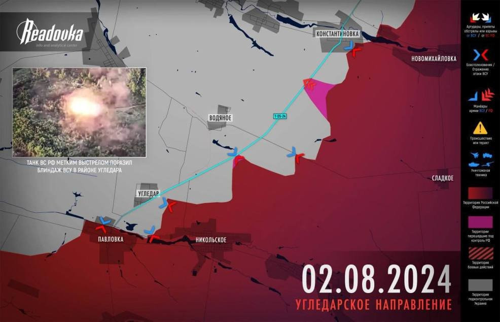 Русские войска на Южнодонецком направлении достигли трассы на Константиновку северо-восточнее Водяного. ВС РФ перерезали одну из двух трасс, по которой снабжался гарнизона ВСУ в Угледаре и окрестностях. Основная тяжесть снабжения лежит теперь на дороге в Богоявленку. В этом селе находится важный логистический узел украинской армии, по которому противник снабжает свои силы в Угледаре, сообщает Telegram-канал Readovka.