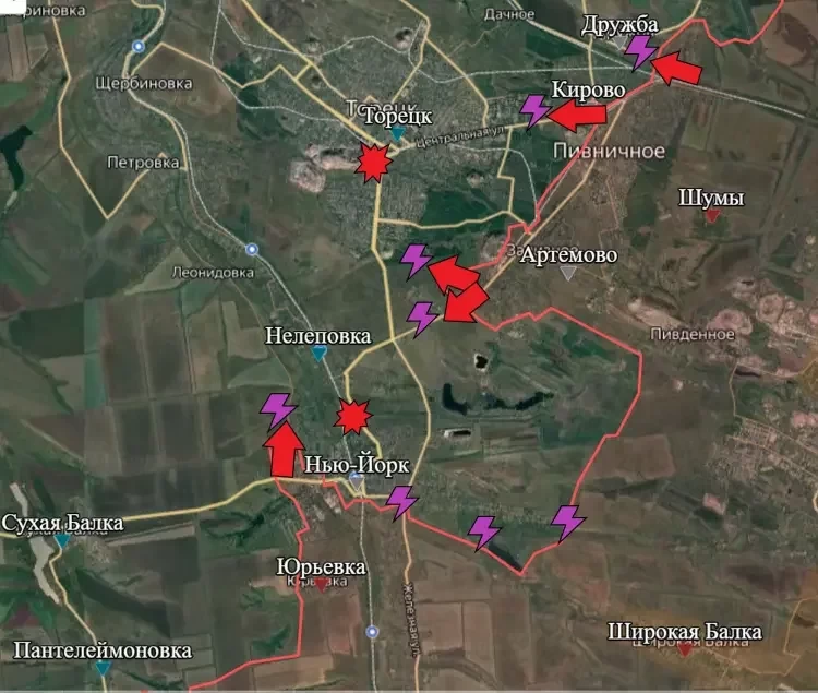 На Торецком ВС РФ расширили контроль территории в Пивничном (Кирово) и Зализном (Артёмово). В Нью-Йорке (Новгородское) продолжаются встречные бои.