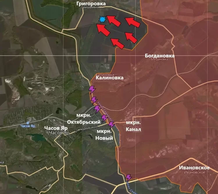 На Константиновском направлении продолжается штурм Часов Яра. Увы, нашим бойцам не удаётся продвинуться в микрорайоне Октябрьский. Подразделения ВС РФ продолжают занимать позиции в самой восточной части микрорайона близ канала "Северский Донец - Донбасс". Об этом сообщает PulsePen.