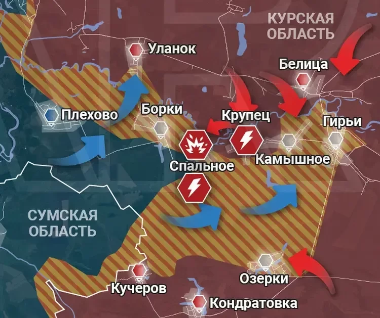 К юго-востоку от основного участка идут бои в Беловском районе. Враг засылает ДРГ к селу Борки, где эти диверсанты берутся в плен или уничтожаются на месте – как повезёт. Подразделения ВС РФ зачистили от врага населённый пункт Крупец. Идут бои за село Спальное, что находится наподалёку. Об этом информирует PulsePen.