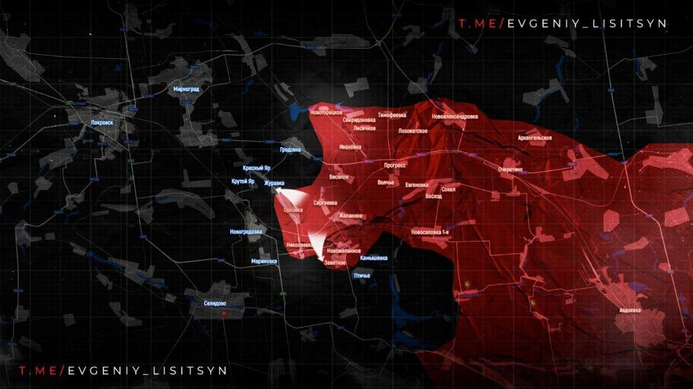 На Покровском направлении продолжается стремительное наступление российской армии. За шесть дней нашим парням удалось взять более 100 кв км. Сейчас активные бои идут в Гродовке, а также в соседнем Крутом Яре и Красном Яре. Также ВС РФ продвигаются в районе Камышово. Угроза над Селидово, Мирноградом и Покровском нависает все больше.