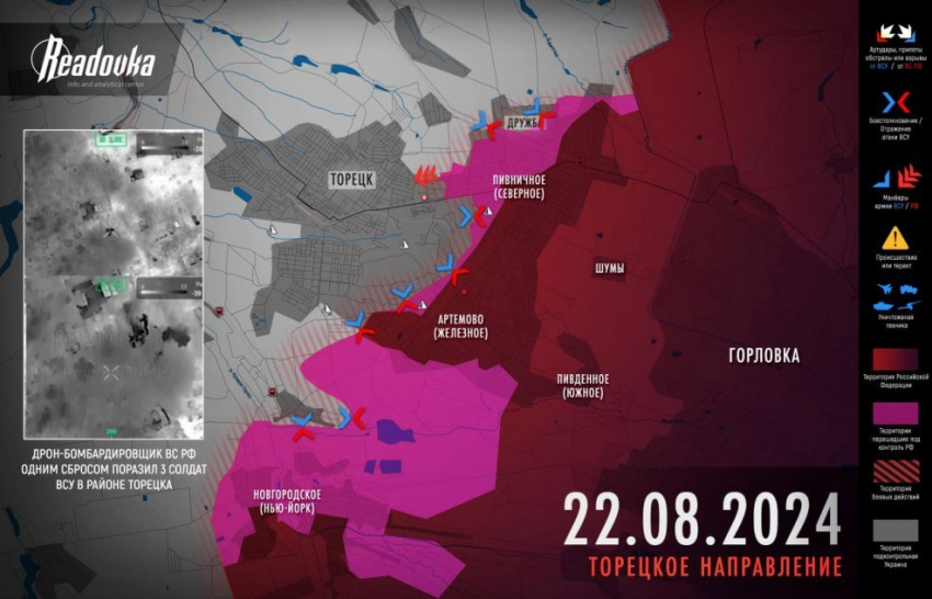 ВС РФ освободили Нью-Йорк после создания непосредственной угрозы окружения поселка. Не желая оказаться в котле, ВСУ не стали удерживать фенольный завод и отступили в Нелеповку и в микрорайон Торецка Забалка. В сам город русские войска вошли из Северного, заняв группу высотных домов по улице 91-й дивизии в микрорайоне №1. ВС РФ также овладели пятиэтажками по улице Виктора Сорочука.