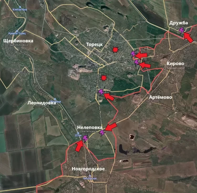 На Торецком направлении продолжаются бои на восточных и южных окраинах Торецка (Дзержинска). Продвижение за последние сутки отмечено к западу от Кирово (расширение зоны контроля вдоль железной дороги).