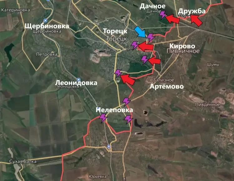 На северном фланге есть успехи - ВС РФ освободили населённый пункт Дружба (официально пока не сообщалось). Следующее село на пути к северным подступам к Торецку - Дачное. К нему наши бойцы уже начали движение вдоль железной дороги.