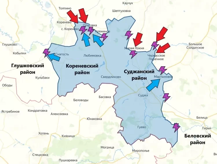 В Суджанском районе украинские боевики продолжают движение на северо-восток от Малой Локни. Идут бои в районе Погребков и Камышовки. Если брать чуть более масштабно, но это продвижение в сторону Льгова и Курчатова.